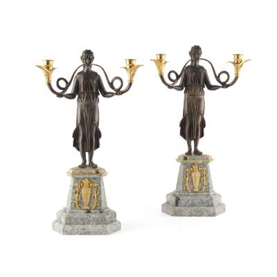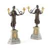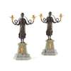 PAIR OF FRENCH MARBLE, PATINATED AND GILT BRONZE FIGURAL CANDELABRA
