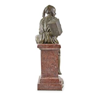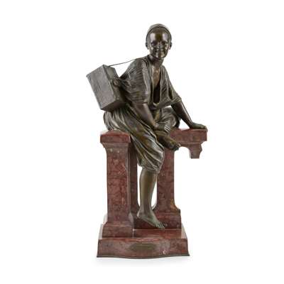 bronze and marble, dark green/brown patina, modelled seated on a marble architectural base, signed ‘Es.Fépin’ and with French bronze foundry stamp ‘Bronze garanti au titre Paris’, the red variegated marble base on a moulded bronze base rim, the front with bronze name plaque ‘((CIRER M’SSIEU!)), Par Pépin 1ere Médaille'