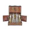 serpentine fronted, the hinged lid and sides containing a fitted rosewood interior, the lift out tiered tray with gilt brass carrying handle fitted with four decanters and four levels of liqueur glasses, on turned feet