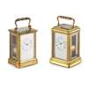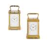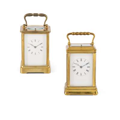 with a white enamel dial with Roman numerals, the gorge case with ripple handle, bevelled glass panels and ogee moulded base with push button repeat to the top, the twin train movement with a silvered platform lever escapement striking the hours and quarters every quarter to two blued coiled steel gongs, the backplate numbered 4334, the base with triple lever for ‘Silent, Strike, Full Strike’; together with a FRENCH BRASS REPEATING CARRIAGE CLOCK, LATE 19TH / EARLY 20TH CENTURY, with a white enamel dial with Roman numerals, the plain corniche case with bevelled glass panels and push button repeat to the top, the twin train movement with a high quality silvered platform lever escapement stamped 'JS' for Joseph Soldano and numbered ‘2476', striking to a coiled steel gong, the backplate also numbered 2476; with two associated leather carry cases (2)