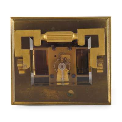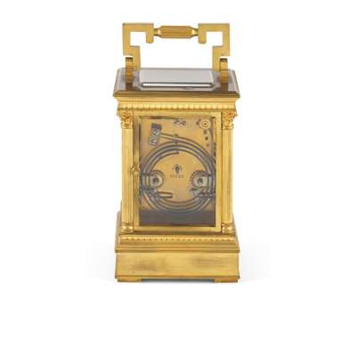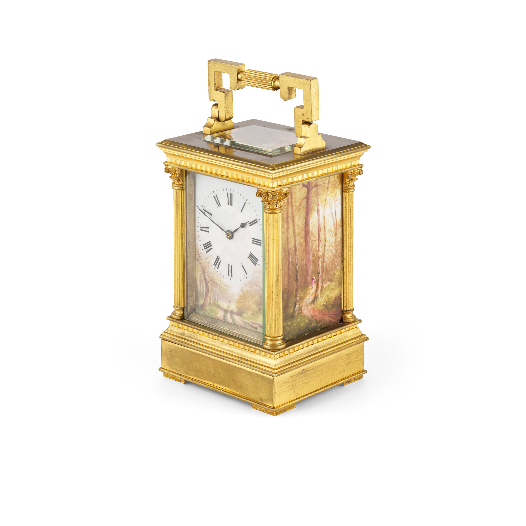 the dial with Roman numerals, painted on to a porcelain panel surrounded by a silvered bevelled edge, this and both side panels painted with scenes of peasant girls on woodland paths, the anglaise riche case with angular swing handle, over a tambour frieze and fluted corner columns with Corinthian capitals, on plinth base stamped ‘23239’, the twin train movement with platform level escapement, striking on to a coiled blued steel gong, the backplate also numbered '23239'