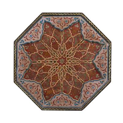 the top with a recessed star pattern and glass insert, above mashrabiya panel sides all with polychrome decoration