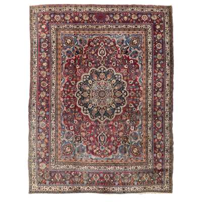 the red field with indigo and puce medallion, blue spandrels, within red border, signature to one end