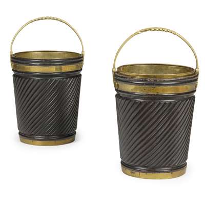 with spiral reeded and tapering bodies with brass liners, bands, and bale handles (2)