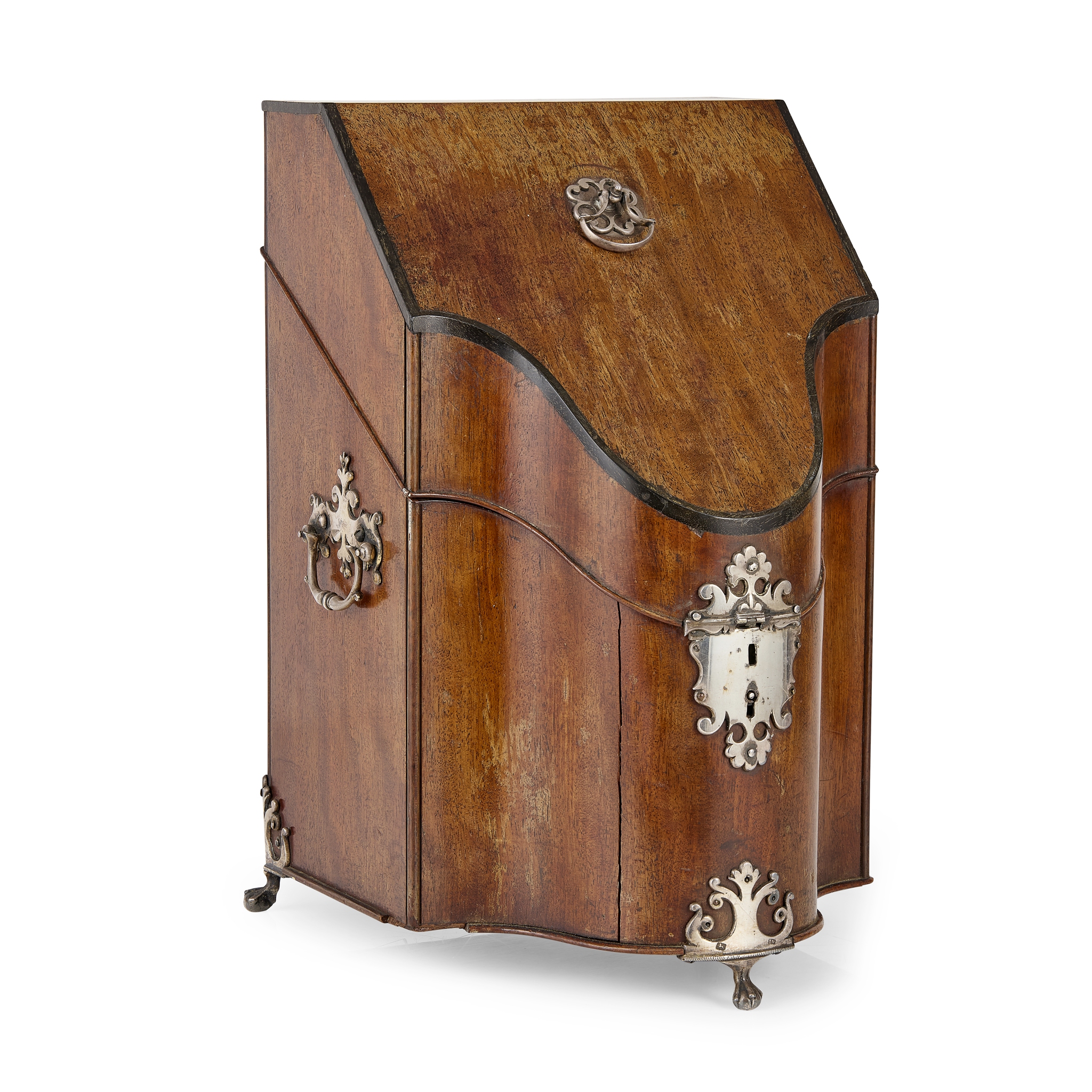 GEORGE III SILVER MOUNTED MAHOGANY SERPENTINE KNIFE BOX