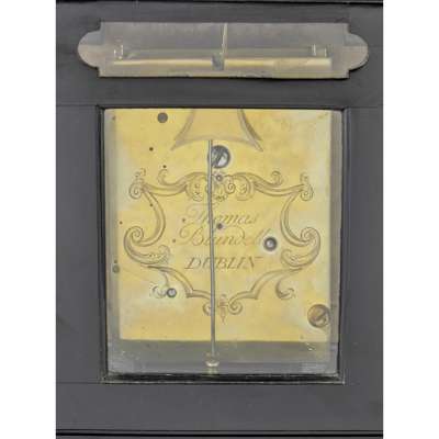 the 6.75 inch breakarch brass dial with silvered chapter ring, Roman numerals and Arabic five minute markers, the matted gilt centre with a mock pendulum and date apertures, pierced gilt mask spandrels, the arch with a silvered signature roundel signed ‘Thos. Blundell, Dublin’, the moulded bell top case surmounted by a brass swing handle, shaped glazed side apertures and rear door, set on gilt bracket feet, the single wire fusee timepiece movement with verge escapement and integral bob pendulum, lacking strike movement, the backplate engraved ‘Thomas Blundell, Dublin’