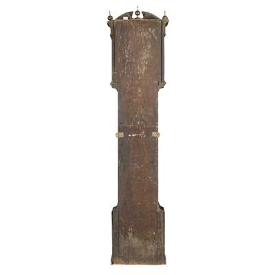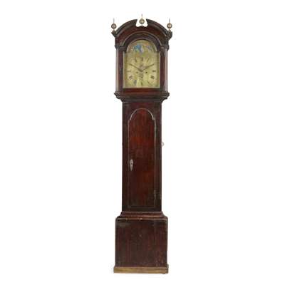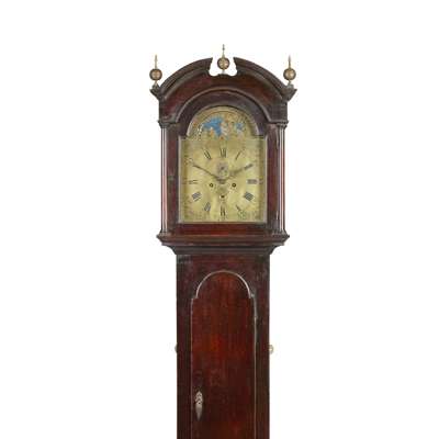 the 12 inch brass breakarch dial with Roman numerals and subsidiary seconds dial and date aperture, the arch with a blue and gilt enamelled moonphase, signed to the centre ‘James Scott, Leith’ with engraved foliate and scalloped spandrels, the dark varnished case with broken arched pediment surmounted by three brass ball finials, over a plain trunk with breakarch door and plinth base, twin train weight driven movement striking a bell