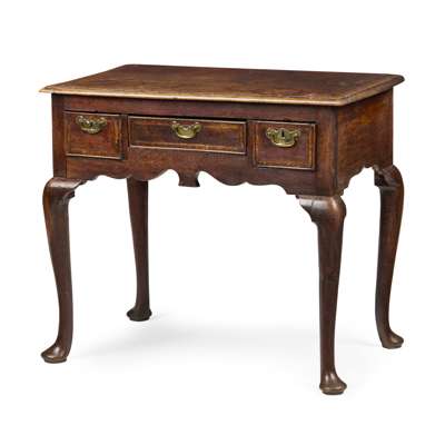 the crossbanded top with a moulded edge, above three short frieze drawers over a shaped apron, raised on cabriole legs ending in pad feet