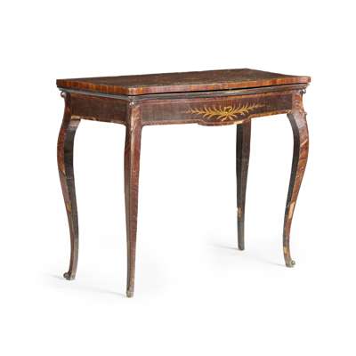 the crossbanded fold-over top inlaid with a centre geometric rosette and line and berry arabesques, opening to a crossbanded and strung green baize playing surface, over a shaped frieze inlaid with a spray of laurel leaves, raised on tapering square cabriole leg carved with acanthus moulding and scroll feet, the rear legs hinged