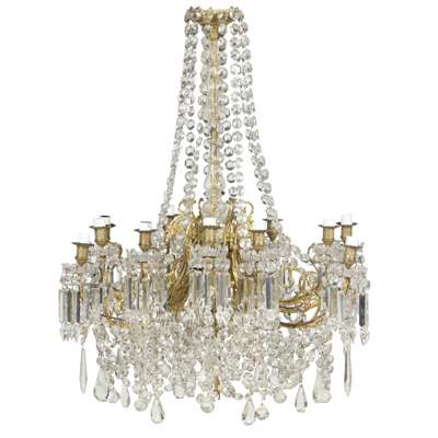 GEORGE III STYLE GILT METAL AND CUT GLASS TWELVE LIGHT CHANDELIER AND PAIR OF WALL LIGHTS