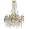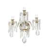 the central baluster shaft hung with swags and issuing scrolling candle arms with brass urn candle nozzles and cut glass drip pans, all hung with swags and prism drops; with three internal light sockets and a pendant socket, fitted for electricity; the brackets with three candle nozzles and a large prism finial (3)