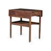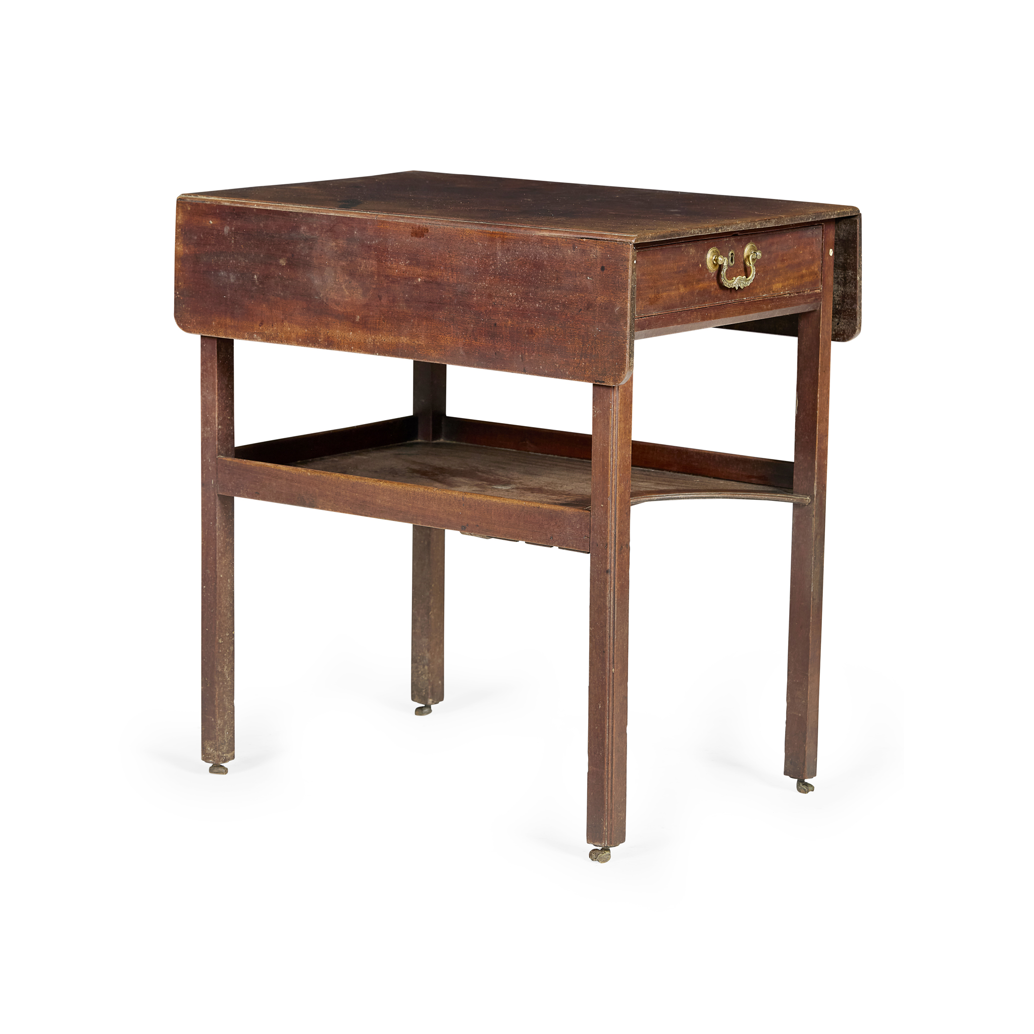 the rectangular top with drop-leaf sides, above a frieze drawer to one end, raised on square straight legs joined by a concave undertier with gallery, and ending on leather castors