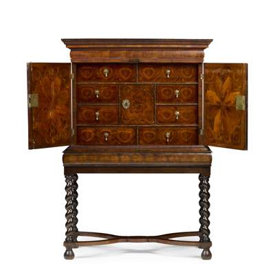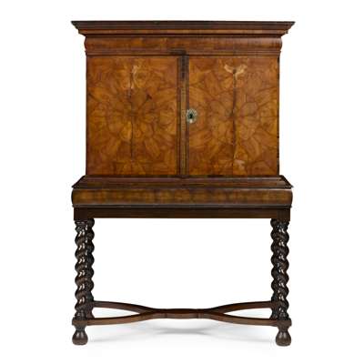 WILLIAM AND MARY STYLE OYSTER VENEERED CHEST ON STAND