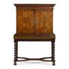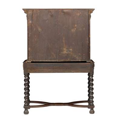 With rectangular moulded cornice over cushion frieze drawer, above twin doors with three circle decoration and quarter circular spandrels, enclosing central cupboard and arrangement of eight small drawers, over deep cushion frieze drawer and later stand with sugar twist legs and shaped stretcher 136cm high, 94cm wide
