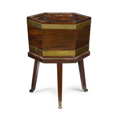 GEORGE III MAHOGANY AND BRASS HEXAGONAL WINE COOLER