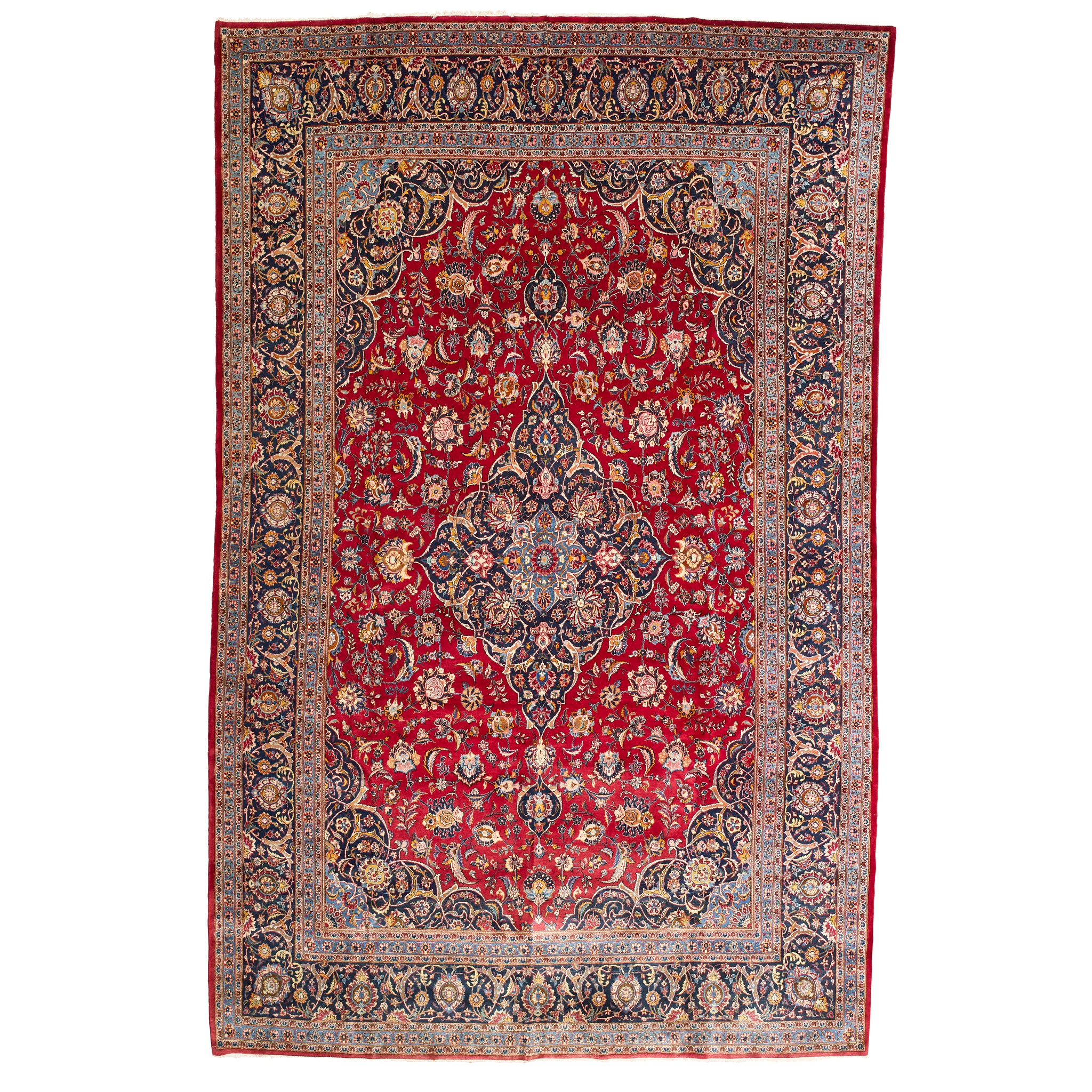 the red field with indigo and blue medallion, similar spandrels, within indigo border