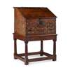 the hinged top opening to an interior fitted with pigeonholes, above a base drawer, the exterior carved with strapwork, flower motifs and palmettes, the stand with turned column legs joined by peripheral stretchers