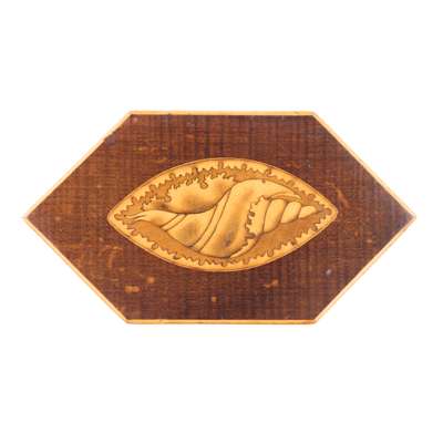 the front panel inlaid with a twin handled urn issuing flowers, the hinged cover inlaid with a conch shell, with boxwood stringing throughout, the interior with two foil lined compartments with covers