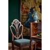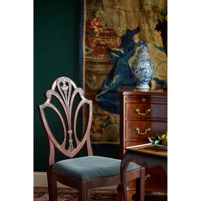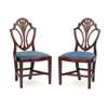 in the Hepplewhite style, with shield backs carved with urns and acanthus scrolls, above serpentine drop-in seats with blue velvet covers, raised on channel moulded square tapered legs joined by stretchers (2)