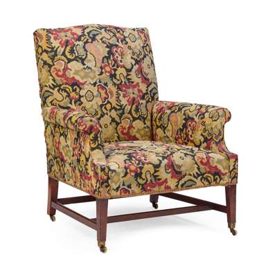 GEORGE III MAHOGANY UPHOLSTERED ARMCHAIR