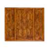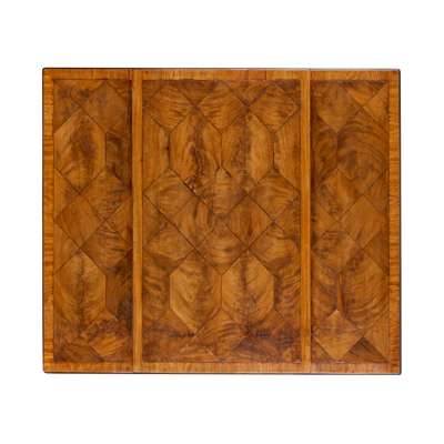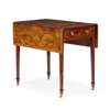 the banded rectangular top with drop leaf sides and veneered in a harlequin diamond pattern, above a frieze drawer to one end, a dummy drawer on the reverse, raised on square tapered legs ending in brass caps and castors