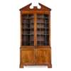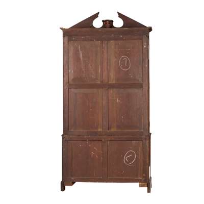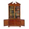 the bead moulded broken pediment top centred by an urn platform, above a pair of pointed astragal glazed doors enclosing adjustable shelves; the lower part with a pair of moulded panel doors opening to four deep drawers, raised on shaped bracket feet with large hidden castors