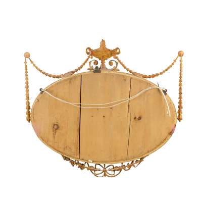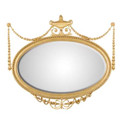 the oval mirror plate in an egg-and-dart and bead moulded frame surmounted by an urn finial and husk garlands