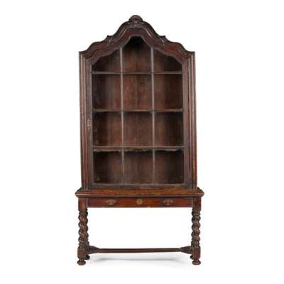 the moulded arched cornice centred with a carved shell motif above a glazed door opening to a shelved interior; on an associated base with a long frieze drawer raised on spiral carved legs joined by a cross stretcher