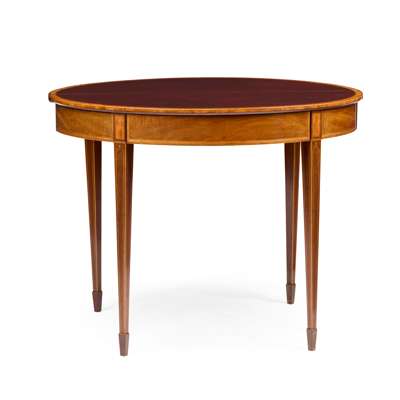 SCOTTISH GEORGE III MAHOGANY, SATINWOOD, AND HAREWOOD TEA TABLE, PROBABLY EDINBURGH