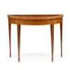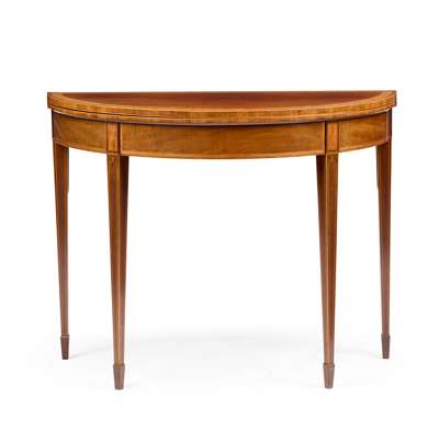 the crossbanded demilune fold-over top opening on double gatelegs, above a plain frieze and raised on square tapered legs outlined with stringing and ending in spade feet