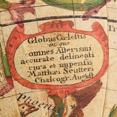 Although Georg Matthäus Seutter (Augsburg, 1678–1757) is well known as a globe-maker, surprisingly little is definitively recorded about his life. He began his career in his grandfather’s brewery before training in cartography and engraving under Johann Baptist Homann in Nuremberg. By 1707, he had established himself in Augsburg as a cartographer and globe-maker. While his maps and city plans survive in abundance, his globes are much rarer, perhaps due to his effort to avoid competing with leading Nuremberg globe-maker Johann Gabriel Doppelmayr (1671–1750).