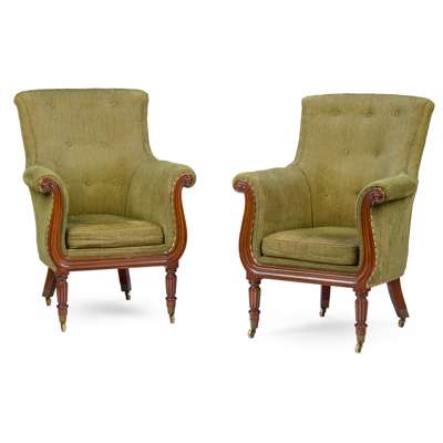 PAIR OF REGENCY STYLE UPHOLSTERED MAHOGANY LIBRARY ARMCHAIRS