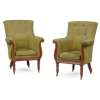 the buttoned backs and enclosed scroll arms above loose cushion seats, raised on reeded turned tapered legs terminating in brass caps and castors, with green upholstery (2)