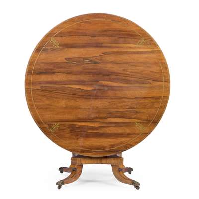the tilt top outlined with brass inlay marked with palmettes; on a square tapered column and quadripartite base with brass stars, raised on sabre legs ending in cast paw brass caps and castors.