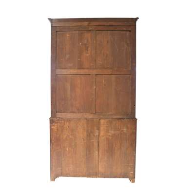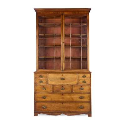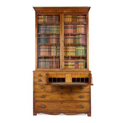 the moulded cornice above a pair of square astragal glazed doors enclosing adjustable shelves; on an associated base with a pair of short drawers and a secretary drawer fitted with pigeonholes and drawers with ivory knobs, above three further short drawers and two long graduated drawers, all outlined with ebonised banding, raised on short bracket feet