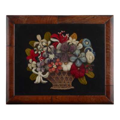 depicting a basket of flowers worked in wool, silk and wire, the basket of woven straw, inside a mahogany veneered and ebonised shadowbox frame