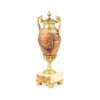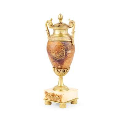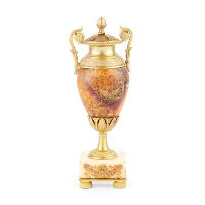 with a fluted cover with acorn finial, the ovoid body of polished Blue John, on a turned socle set on a cream marble plinth base on pinecone feet