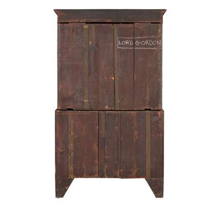 the moulded cornice above a frieze with fan medallion inlay, over two short and three long graduated drawers; the lower part with three further long drawers, raised on French bracket feet