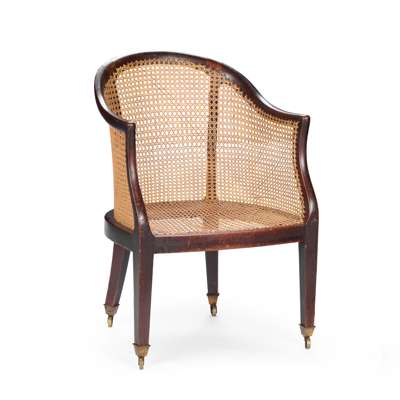 with an arched back and enclosed arms above a caned seat, raised on square tapered legs ending in brass caps and castors