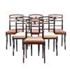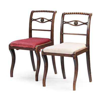 the bobbin turned top rail above a pierced horizontal splat set with a gilt metal rosette and drop in pad seat, six with bobbin turned supports and back rails, four plain, raised on a sabre leg, two chairs ebonised (10)