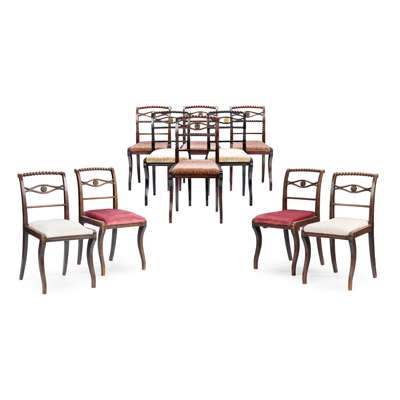 MATCHED SET OF TEN REGENCY BRASS MOUNTED STAINED BEECH DINING CHAIRS