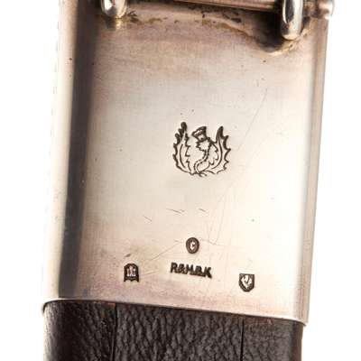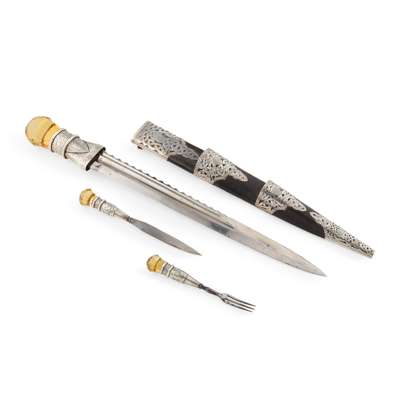 mounts with full hallmarks, the handle formed with a large facetted citrine, set in a strapwork engraved handle with Celtic beasts, the steel blade blank, the leather covered scabbard set en suite with bi knife and fork, the mounts and chape with elaborate pierced engraved strapwork design with Celtic beast heads, the cartouche engraved with a heraldic stone tower