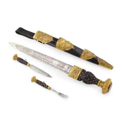 the gilt brass mounts unmarked, with large basket weave carved handle with applied studs, the flared pommel mount with embossed thistles and foliate mount for foil backed crystal base of handle with large mount with displayed thistles and regimental badge, the leather covered scabbard with embossed and chased mounts and set with bi knife and fork with thistles, regimental badge and number, the etched blade with highly intricate design showing battle owners, regimental badge, motto, badge and cypher, signed to the base ‘Ponder, 37 Duke St St James, London’