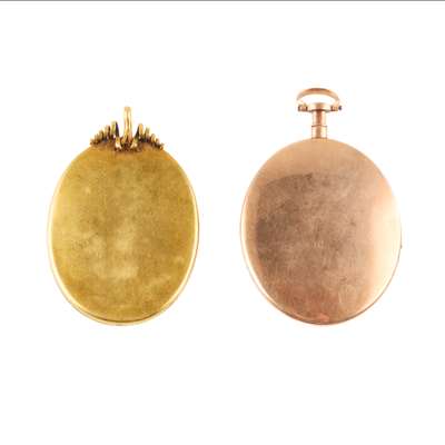 both oval, painted on copper or vellum, depicting the same gentleman with long flowing dark hair, a high wide white collar and a black doublet, one set inside a period glazed gilt brass locket with suspension loop, the other set inside a Georgian yellow metal locket