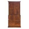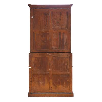 the moulded cornice above a pair of glazed doors enclosing adjustable shelves; the lower part with a moulded panel secretaire drawer opening to an arrangement of drawers and pigeonholes and a baize writing surface, over a pair of panel doors enclosing sliding trays, on a plinth