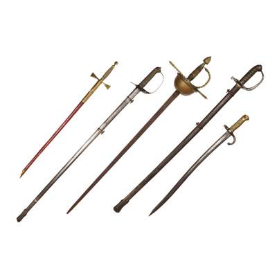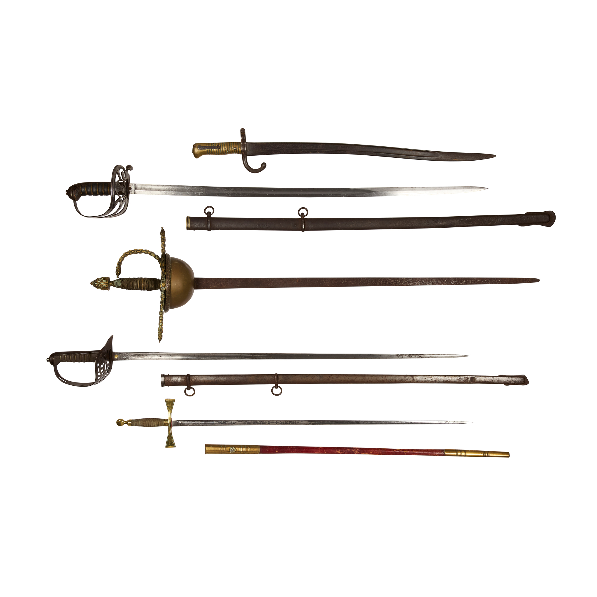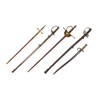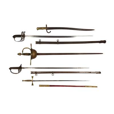 one with the blade marked H. Lamb & Co, St John's Sq, Clerkenwell, with a red leather and brass sheath; a Volunteer Rifles sword with sheath, the blade engraved with a strung horn and inscribed ‘Victoria Rifles’ with a bird crest to one side and a crown to the reverse; a similar sword, the steel handle with pierced crowned ‘VR’ monogram; a continental cup hilt rapier sword with brass chain moulded handle and finial; and a French bayonet sword with ribbed brass hilt (5)
