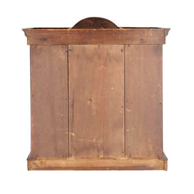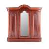 the moulded cornice with an arched centre above a mirrored door enclosing drawers, flanked by moulded doors opening to hanging space, on a plinth base