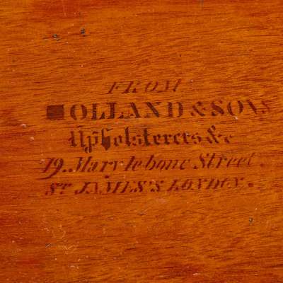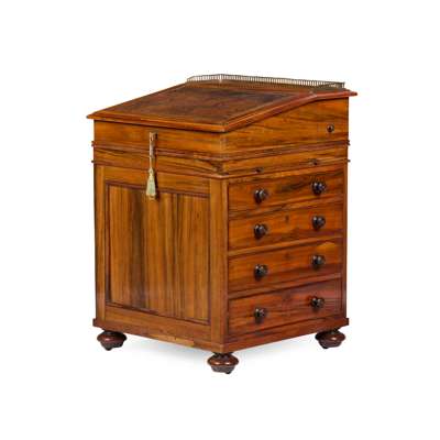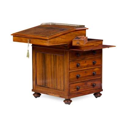 the sliding top with a brown leather slope and pierced brass gallery, opening to an interior fitted with drawers, above a slide and pen tray over four graduated drawers, on bun feet with castors; stencil maker's mark in two places ‘FROM HOLLAND & SONS Upholsterers &c 19 Marylebone Street St James London’ and stamped 3763