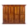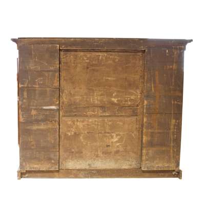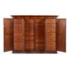 the moulded cornice above four moulded double panel doors, the centre pair opening to an arrangement of twenty-eight short drawers, flanked by cupboards with further banks of deep drawers, on a plinth base
