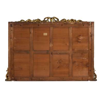 the rectangular mirror plate in a laurel and bead moulded frame surmounted by a large ribbon-tied cresting with laurel bands; with old trade label to the reverse ‘CICERI, MANTICA & TORRE, Carvers, Gilders & Looking Glass MANUFACTURERS, 81 Leith Street, EDINBURGH’